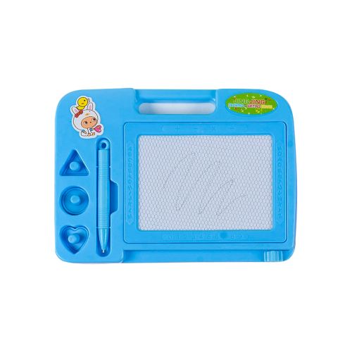 Яркая пластиковая доска для рисования. Имеет магнитную основу. В наборе: магнитная ручка и 3 печати (в форме треугольника, круга и сердечка). Готовый рисунок можно стереть, потянув за бегунок внизу доски.