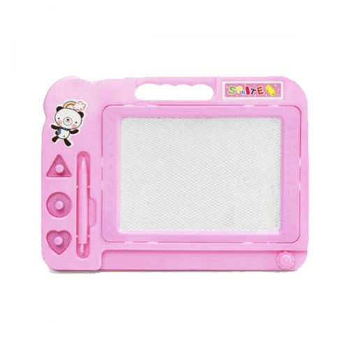 Яркая пластиковая доска для рисования с магнитной основой. В наборе: магнитная ручка и 3 печати (в форме сердца, круглая, треугольная). Готовый рисунок можно стереть, потянув за бегунок внизу доски. Размер поля для рисования - 16 х 11,5 см.