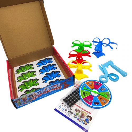 Комплектация: 4 пары очков с усами разного цвета, 16 элементов бороды, рулетка, бритва, ножницы, соединительные элементы