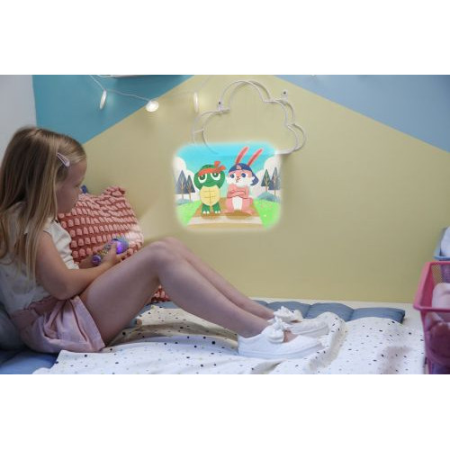 Проектирует 16 красивых изображений из 2 дисков. В набор, также, входит кейс для хранения дисков. Сказка имеет профессиональную озвучку, доступную через QR-код. Проектор оснащен функцией фокусировки для четкой проекции. Работает от 2 батареек ААА (не входят в комплект). Подходит для детей от 3 лет.