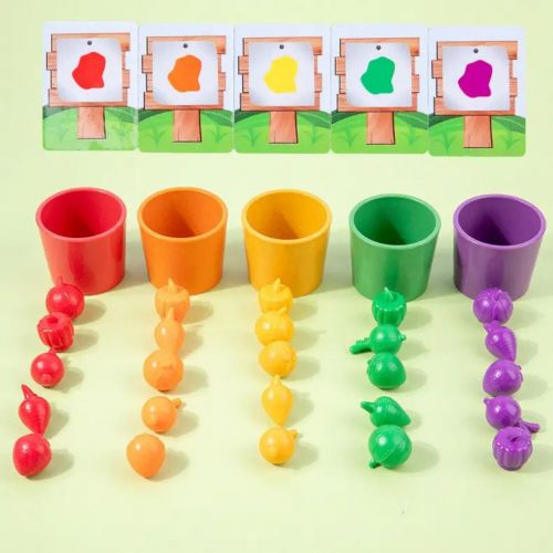 Логическая игра деревянная основа, 5 чаш для сортировки, 25 резиновых овощей, 10 двусторонних карт с заданиями