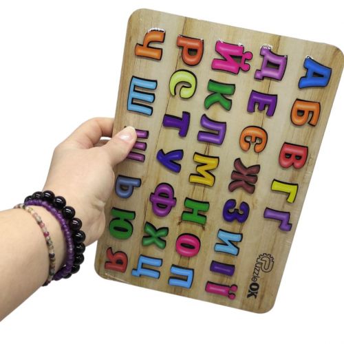 Деревянный сортер-вкладыш с фигурками в виде букв украинского алфавита. Поможет ребенку начать изучать буквы в веселой игровой форме. Также содействует развитию воображения, мелкой моторики рук и логического мышления. Игрушка сделана из безопасных и экологически-чистых материалов. Размер доски - 27х19 см.
