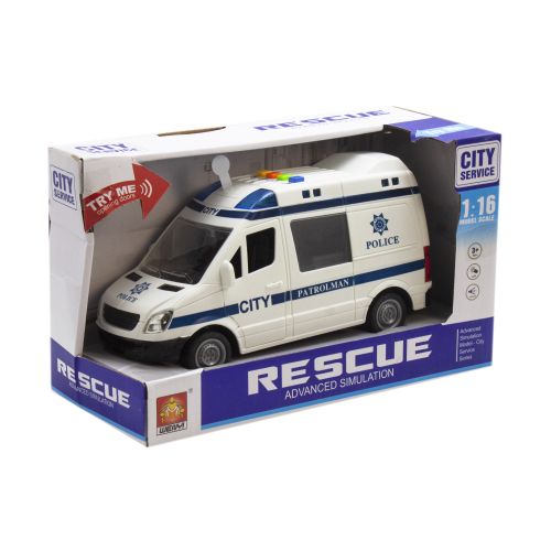 Инерционная интерактивная полицейская машина. Имеет звуковые и световые эффекты. Открываются боковые двери и задняя дверца. Внутри салона находятся кресла. Изготовлена из качественного пластика. Масштаб: 1:16.