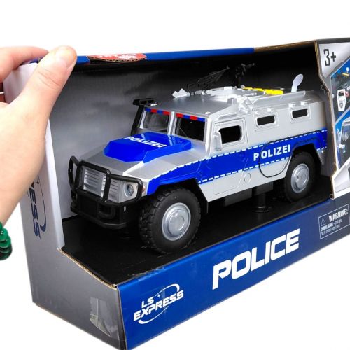 Полицейский внедорожник оснащен фрикционным механизмом: для запуска достаточно немного откатить машинку назад и отпустить. Модель имеет реалистичное оформление в стиле служебного транспорта.