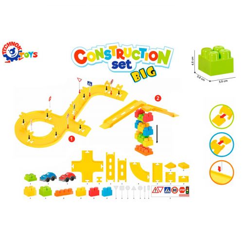 Яркий пластиковый конструктор, состоящий из 44 деталей довольно крупного размера, 7 дорожных знаков и двух машинок. Конструктор развивает мелкую моторику рук, фантазию и воображение. В наборе есть все необходимые детали для игры в гонки с друзьями. Изготовлено все из качественного пластика.