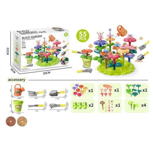 Конструктор "Цветочный сад", набор садовода, 55 элементов, грабли, лопата, вила, лейка, вазон, цветы, в коробке