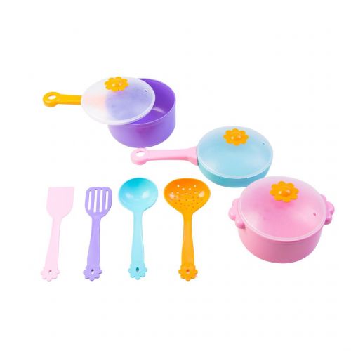 Яркий набор пластиковой посуды. Состоит из: сковородок с крышечками 2 видов, кастрюли с крышечкой, двух лопаток, шумовки и половника. Ручка со сковородки снимается, превращая ее в удобное блюдо для выпечки. Диаметр кастрюльки: 12 см._