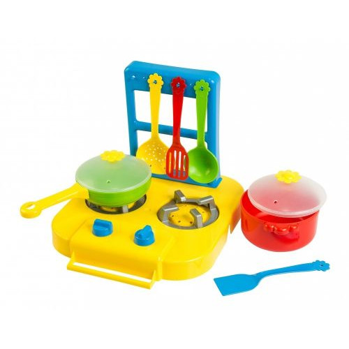 Набор яркой пластиковой посуды "Ромашка" состоит из плиты с 2-мя конфорками и подставкой для лопаток, кастрюльки с крышечкой, кастрюльки с ручкой и крышечкой, и 4х приборов для готовки._