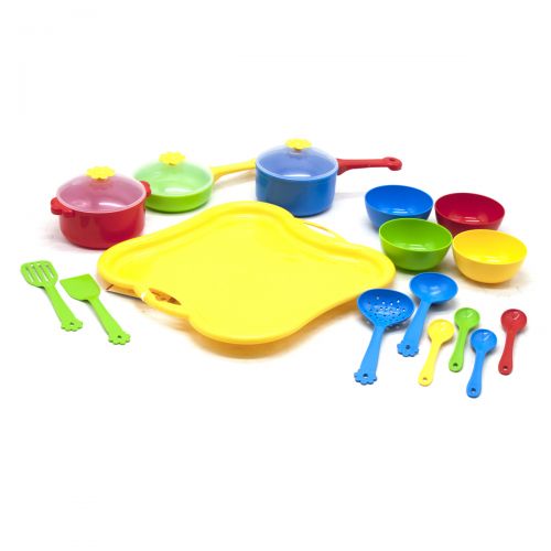 Набор яркой пластиковой посудки "Ромашка". В комплекте: поднос (29 х 29 см), кастрюлька с крышечкой, сковородка с крышечкой, кастрюлька с ручкой и крышечкой, 4 прибора для готовки, 4 тарелки и 4 ложечки.