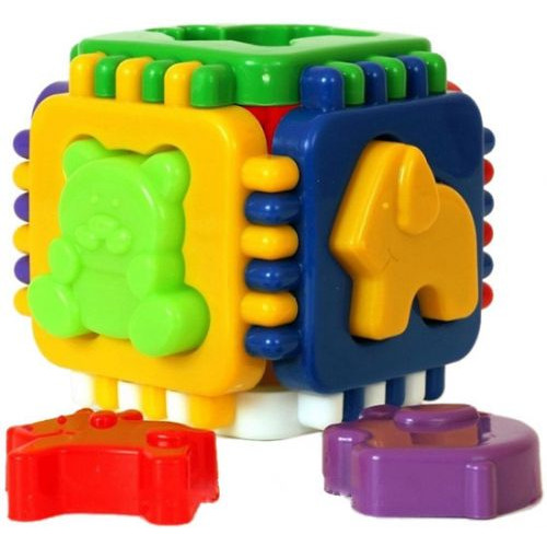 Кубик логический. Сортер в виде складываемого куба. Состоит их 6 емкостей с отверстиями разной формы и размера, а также фигурок-вкладышей в виде животных._