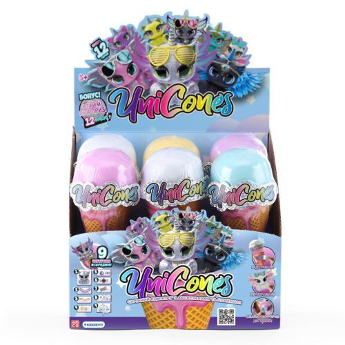 Добро пожаловать в увлекательный мир UNICONES - коллекции миленьких единорогов в рожках-мороженом! Каждый единорог в рожке имеет свои уникальные особенности, а также дополнительные сюрпризы, такие как слайм, разнообразный декор и очаровательные аксессуары. Ваши любимцы смогут получить новые образы, которые вы можете создать, совмещая разные аксессуары. 12 героев в коллекции.