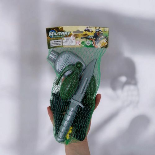 Іграшкова зброя - пістолет, 2 гранати, рация, бінокль, фляга, ніж, пульки, у сітці