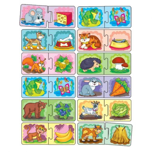Развивающая игра для малышей дошкольного возраста поможет ребёнку выучить некоторых животных и узнать, чем они питаются. Игра разовьет логическое мышление, память, внимание, словарный запас и мелкую моторику рук. Есть несколько вариантов игры.