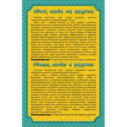 Могут играть 2-4 человека. Карточки выкладываются на стол картинкой вниз и перемешиваются. Очередность ходов определяется считалкой, или случайным образом. Игроки по очереди переворачивают две карточки так, чтобы остальные участники игрыих увидели и запомнили мх расположение на столе. Если открытые карточки составляют пару (имеют одинаковую картинку), то игрок собирает их и откладывает в свою стопку. Он продолжает переворачивать карточки до тех пор, пока не откроет две разные. Такие карточки нужно развернуть картинкой вниз, а ход переходит к следующему игроку. Игра заканчивается, когда откроются все пары карточек. Побеждает игрок, нашедший больше всего парных карточек._