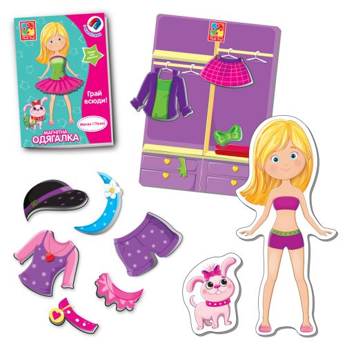 Комплектация: 2 куклы, 39 магнитных элементов одежды, шкаф для одежды, модный журнал