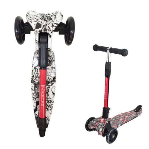 Самокат со светящимися колесами (3 PU колеса). Размер колес 11х2,5 см. Также, есть подножка(дека), размером 28х11см. Руль выполнен из алюминия; регулируется по высоте (от 56 до 71 см.). У ручек на руле резиновое покрытие. Самокат складывается, что делает его удобным при транспортировке.