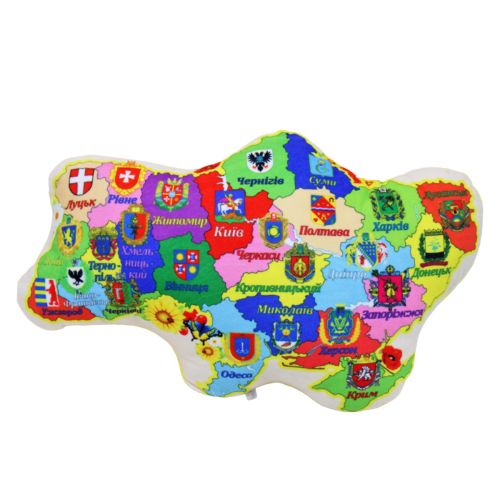 Красивая декоративная подушечка в виде карты Украины и изображением границ всех областей и из гербами. Будет замечательным подарком и хорошим украшением интерьера. Очень приятная на ощупь, мягкий синтепоновый наполнитель. Размер: 42х25х10 см. Изготовлено в Украине._