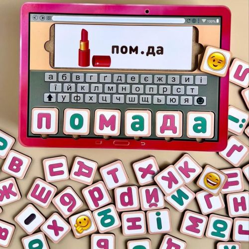Игровой набор "Собери слово по картинке". В комплекте есть основание-планшет, 74 плашки с буквами, 2 плашки -знака и 84 карточки с картинками разной тематики. Из букв собирается слово, которое выпадает в ходе игры на картинке. Отлично тренирует память, внимание, усидчивость. _