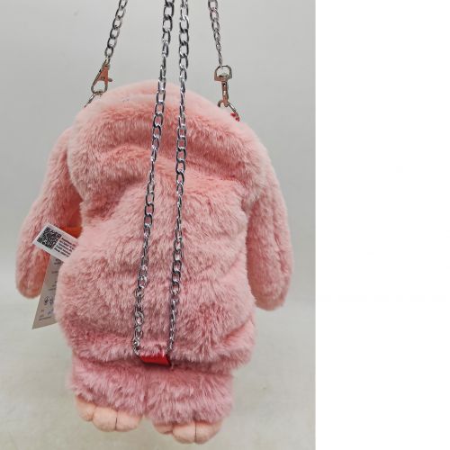 Милый детский рюкзачок в виде зайчика. Очень мягкий и приятный на ощупь, выполнен из яркой пушистой ткани. Глазки пластиковые. Оснащен двумя металлическими лямками-цепочками на карабинах. Есть одно отделение на молнии, в которое можно положить телефон, записную книжку, ключи или другие небольшие принадлежности. Размер рюкзака - 27х20х11 см.