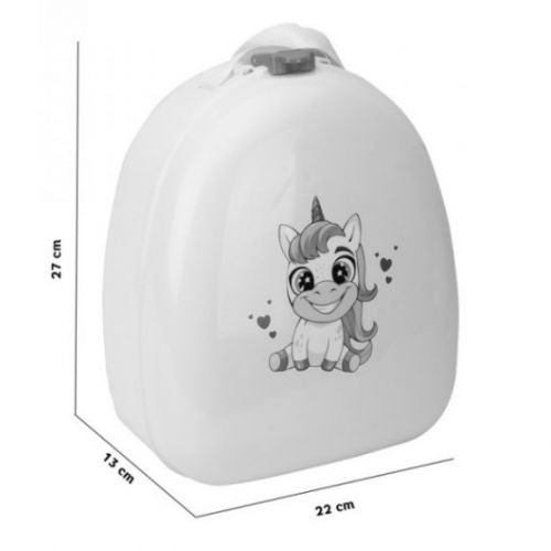 Детский пластиковый рюкзак. Имеет две регулируемые по длине ручки и петельку. Выполнен полностью из пластика, с милой картинкой-наклейкой на лицевой стороне. Размер 20х24х10 см. _