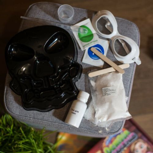 Комплектация: Пищевые красители (зеленый, синий), ластиковый остров "Череп", палочки для перемешивания, пипетка Пастера, стаканчики, мерный стакан, гидрокарбонат натрия, лимонная кислота, ложка, пена для скамьи, защитные перчатки, защитные очки, пошаговая.