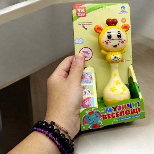 Игрушка выполнена в виде забавного животного, на животе которого размещается активная кнопка. Одно легкое нажатие, и игра начинает подсвечиваться и воспроизводить веселые песенки на украинском языке (5 песенок). На голове животного есть маленькая шапочка: покрутите ее по кругу и услышите характерный звук трещотки. Погремушка выполнена в приятных пастельных оттенках, которые станут настоящим удовольствием для глаз. Мягкая подсветка игрушки позволяет использовать его и в вечернее время. Размер погремушки – 14х4,5х4,5 см. Для детей старше 12 месяцев.