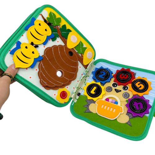 Мягкая книга бизиборд (фетр, бусины, прозрачный карман, цифры, элементы на липучках и кнопках, овощи, фрукты, насекомые)