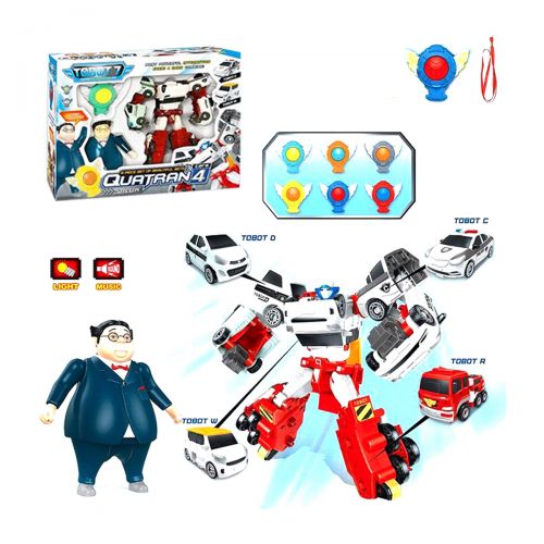 Набор Трансформеры герой мультсериала "Тоботы". Четыре машины Тобот D, Тобот C, Тобот W и Тобот R интегрируются и создают нового персонажа – мощного робота Кватрана. Также, в наборе одни из главных злодеев мультфильма - Дилук и музыкальный медальон. У фигурки подвижные руки и ноги, светится разными цветами.