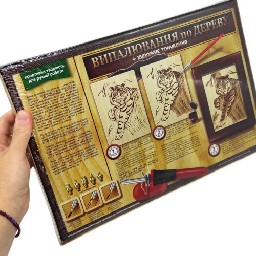 Комплектация: Декоративная рамка - 2 шт., заготовки для создания картины - 5 шт., насадки для выжигателя - 6 шт., электровыжигатель - 1 шт., подставка для выжигателя - 1 шт., тонировочная краска - 1 шт., кисточка - 1 шт., пошаговая инструкция
