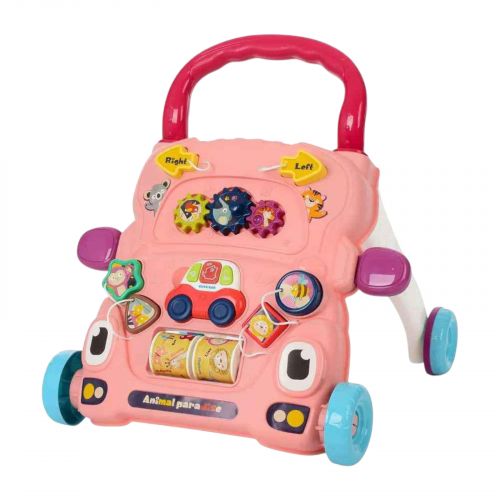 Ходунки-каталка с игровым центром (РОЗОВЫЙ), ОЗВУЧКА УКРАИНСКИМ ЯЗЫКОМ, сортер, шестерни, свет, песни, сказки, на батарейках, в коробке