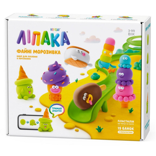 Меганабор пластилина, который самостоятельно затвердевает, ЛИПАКА – ФАЙНИЕ МОРОЖЕНОЕ – развлечет и детей, и взрослых. С помощью анимационных инструкций в приложении HEY CLAY, Вы сможете слепить 6 уникальных персонажей: Торнадика, Тепльодика, Кульконавтов, Йети Сэндвич, Рожок Кувырок и Чоко Бро. Пластилин затвердевает на воздухе в течение 24 часов, после чего можно играть созданными фигурками.