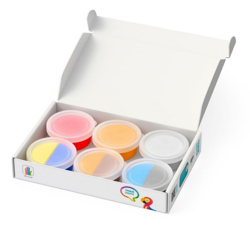 В набор может входить до 9 разных цветов (баночка может содержать пластилин двух разных цветов).