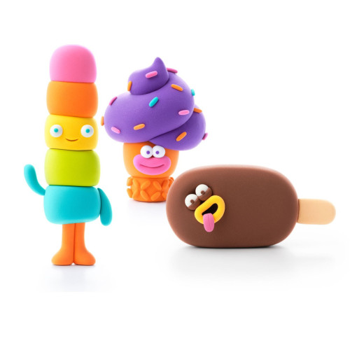 Набор самозатвердевающего пластилина ЛИПАКА – КЛАССНОЕ МОРОЖЕНОЕ: ТЕПЛЕДИК, ТОРНАДИК, ЧОКО БРО – развлечет и детей и взрослых. С помощью анимационных инструкций в приложении HEY CLAY, Вы сможете слепить 3 забавных героев. Пластилин твердеет на воздухе за 24 часа, после чего можно играться созданными фигурками.