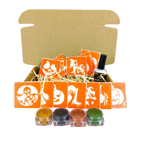"Хэллоуин - глиттер" - это набор из трафаретов тыквы Джека, летучих мышей, ведьмочек и других героев в размере 5 на 5 см, с которыми будет легко научиться и рисовать блеск-тату!