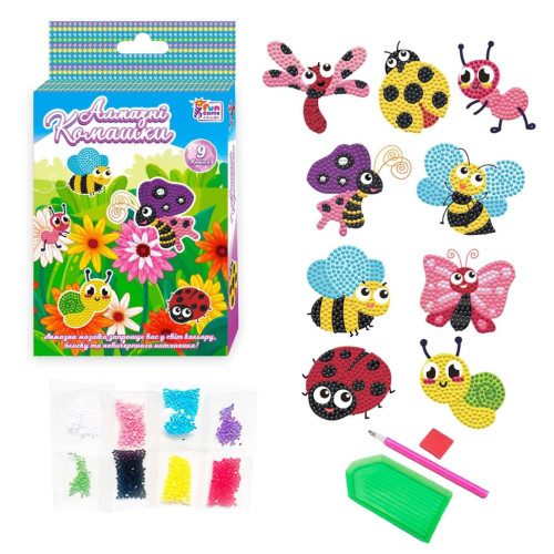 В набор включено все необходимое для того, чтобы сделать свой собственный набор наклеек с букашками, которыми можно будет потом украсить свои записи или пространство вокруг себя. Сложность такой работы невысока, поэтому она прекрасно подойдет для младших детей. Алмазные мозаики — это веселый способ развить мелкую моторику, аккуратность и терпение ребенка.