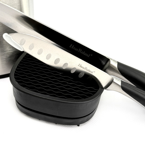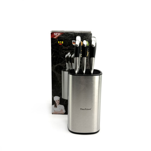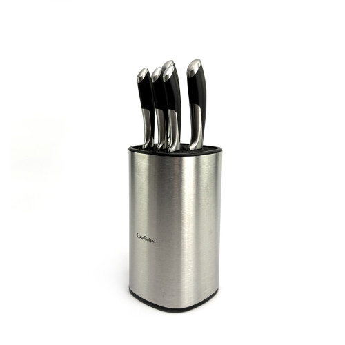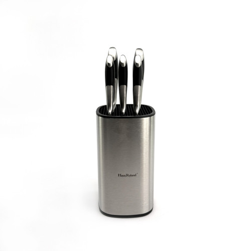 Набор ножей Haus Roland HR628-1 — это выбор тех, кто ценит качество и долговечность. Лезвия изготовлены из нержавеющей стали марки 3Cr13, известной своей коррозионной стойкостью и способностью долго удерживать заточку. Цельнокованые рукоятки из нержавеющей стали обеспечивают превосходный баланс и полный контроль над каждым движением. Бесшовная конструкция ножей гарантирует максимальную гигиеничность, исключая скопление остатков пищи. В комплект входят 5 самых востребованных ножей, от шеф-ножа до японского сантоку, которые хранятся в элегантной и устойчивой подставке из нержавеющей стали.