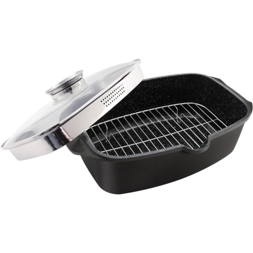 Раскройте свой кулинарный потенциал с жаровней Haus Roland HR145-1. Корпус из литого алюминия обеспечивает превосходное распределение жара. В комплекте идет специальная съемная решетка из нержавеющей стали. Она приподнимает мясо или птицу над дном, обеспечивая равномерное запекание со всех сторон и позволяя лишнему жиру стекать вниз. Износостойкое титановое антипригарное покрытие гарантирует долговечность, а возможность мыть жаровню в посудомоечной машине делает уход за ней легким. Ключевая особенность модели — крышка из закаленного стекла. В ее ручке сделано специальное отверстие, которое позволяет добавлять масло, вино или соусы при приготовлении пищи, не снимая крышку.