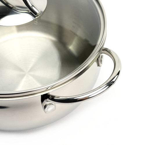Ключевым преимуществом набора является его повышенная прочность: стенки корпуса выполнены из нержавеющей стали толщиной 0.6 мм, а капсульное дно усилено массивным слоем железа в 2.0 мм. Это обеспечивает посуде превосходную теплоемкость, равномерное распределение тепла и устойчивость к деформации. Элегантная округлая форма «яблоко» не только эстетична, но и практична — она способствует лучшей циркуляции пара и удобна для перемешивания. Массивные литые ручки из нержавеющей стали гарантируют надежный и безопасный хват. Внутренняя сатиновая полировка устойчива к царапинам, а мерная шкала поможет точно следовать рецептам.