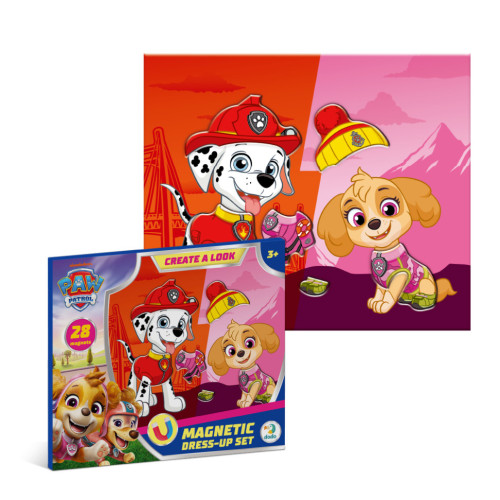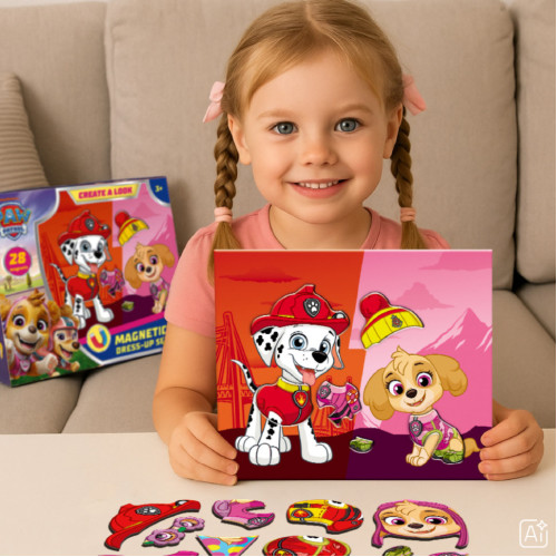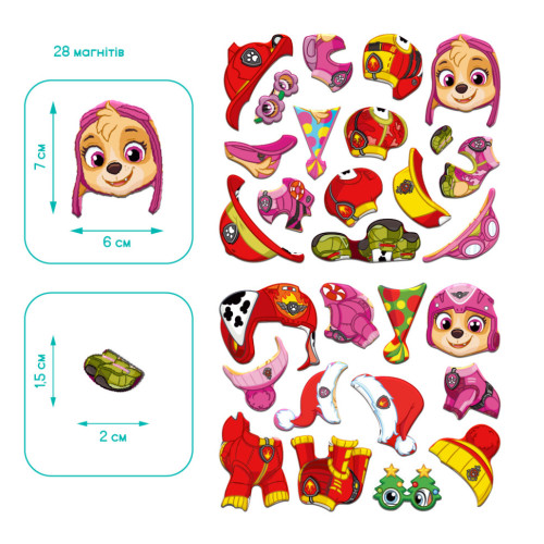 Эта магнитная игра сочетает в себе творчество, развлечение и развитие: яркая магнитная доска и 28 магнитных элементов позволяют ребенку комбинировать одежду, аксессуары и создавать стильные образы для героев Marshall и Skye из популярного мультсериала Paw Patrol.