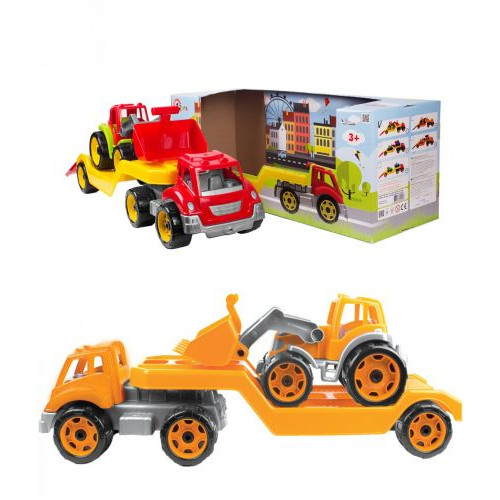 Пластиковый оранжевый автовоз с заездом. В комплекте также идёт трактор._