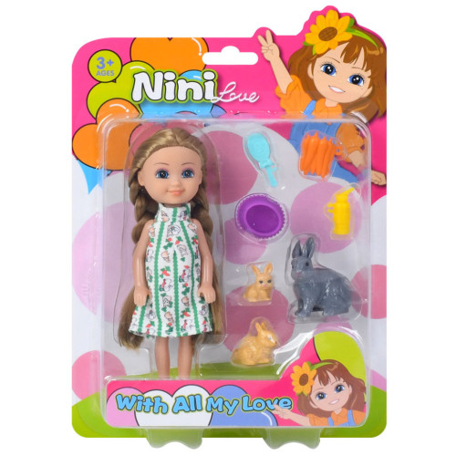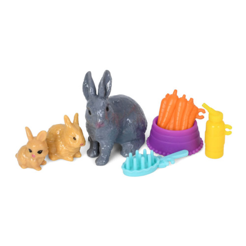 В наборе кукла размером 14 см, 3 кролика, морковка и аксессуары, что позволяет ребенку придумывать разнообразные истории и заботиться о питомцах.
