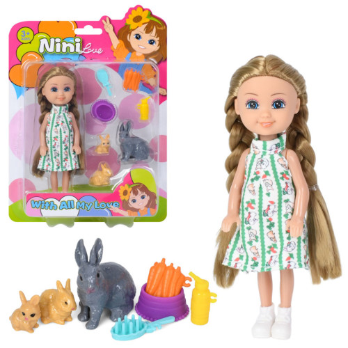 Детский игровой набор с куклой 618-18, 3 кролика, морковь, аксессуары