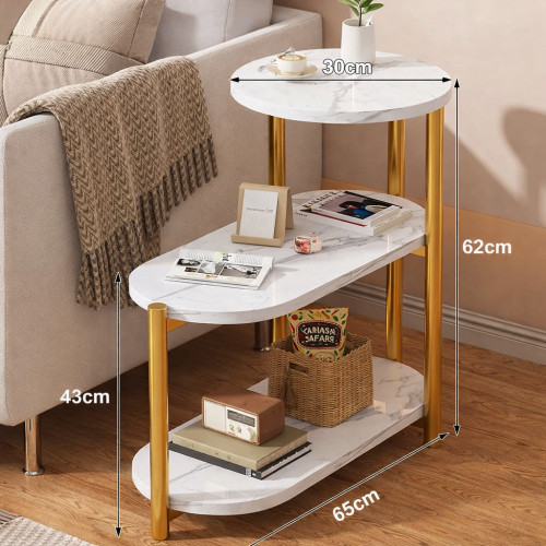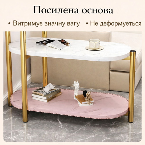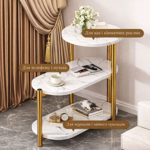 Белая столешница с мраморным узором в сочетании с золотыми металлическими опорами создает элегантный акцент в интерьере. Благодаря трем уровням столик не только украшает пространство, но и обеспечивает удобное хранение.