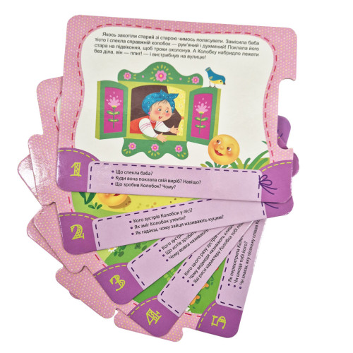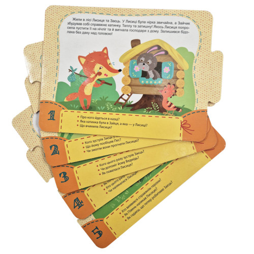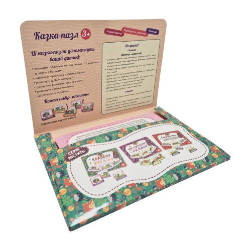 Иллюстрации любимых детских сказок расположены на 5 карточках-пазлах. В наборе идет две сказки (с лицевой стороны и с обратной стороны). Кроме сюжетных изображений и текста сказки, на каждой карте находятся несколько вопросов относительно того, что изображено. Они ориентированы на развитие логического мышления, фантазии и внимательности. Пазлы смоделированы таким образом, что ребенок сможет составить свой сюжет сказки, разместив карточки по собственному желанию и фантазии.