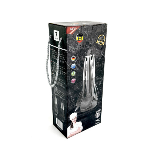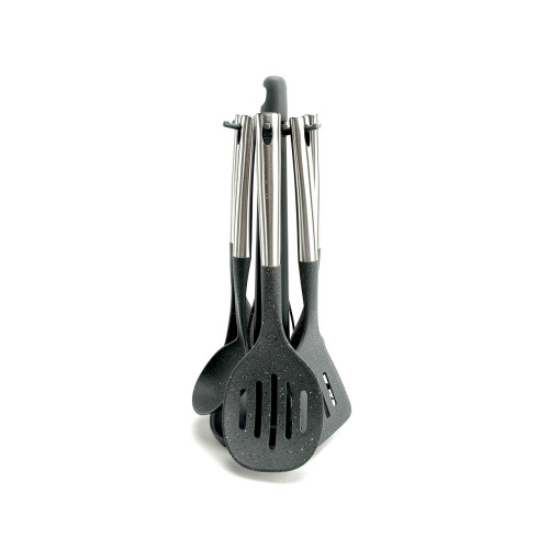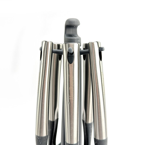 Набор Haus Roland HR912-1 создан для тех, кто ценит надежность, эстетику и порядок. Рабочая часть инструментов изготовлена из высококачественного нейлона с уникальным покрытием "под камень", которое не только эффектно выглядит, но и бережно относится к антипригарным поверхностям вашей посуды. Ручки из нержавеющей стали обеспечивают прочность, гигиеничность и долгий срок службы. Центральный элемент набора — элегантная подставка с возможностью вращения на 360°, которая гарантирует легкий и быстрый доступ к любому предмету.